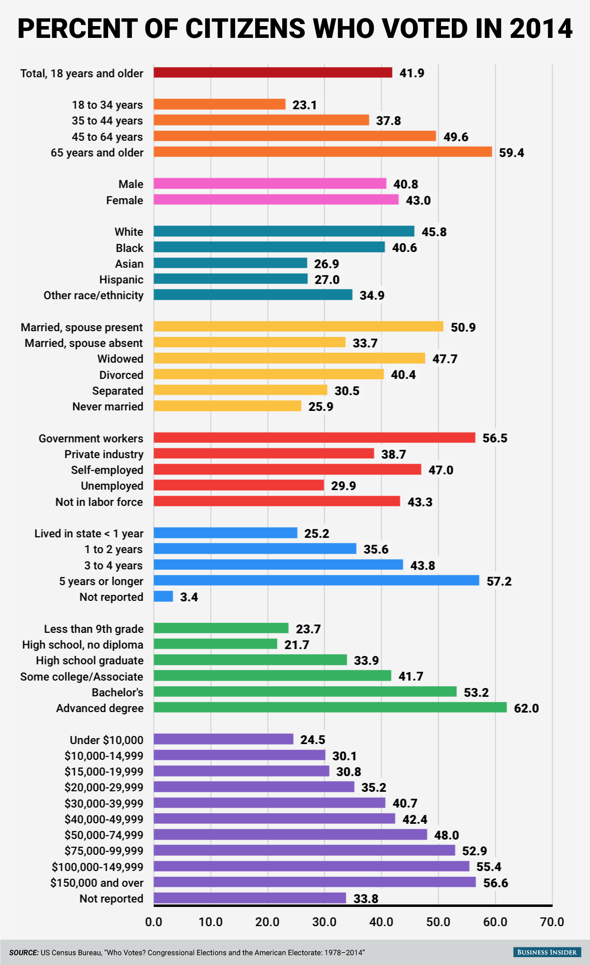 About 36.4% of the voting-eligible population cast ballots in 2014 (http://www.electproject.org/2014g).